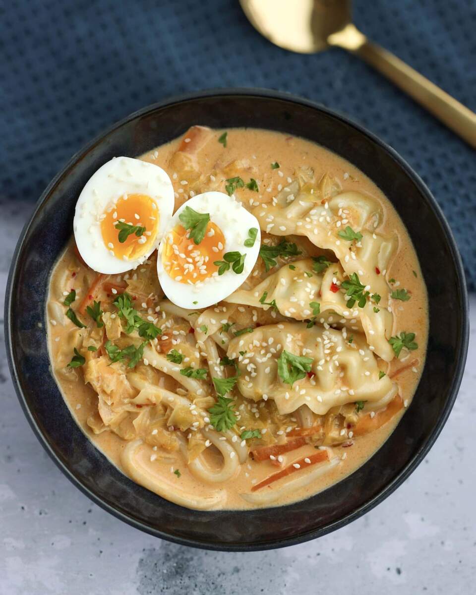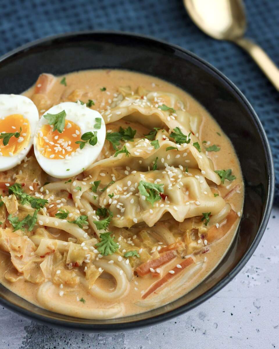 Dumpling suppe er en af de retter, jeg ofte laver, når aftensmaden gerne må være både nem og hurtig, men stadig smage lækkert. Den her version er en cremet asiatisk suppe med nudler, hvor dumplings, grøntsager og en fyldig suppe med kokosmælk giver en virkelig god og mættende skål suppe. Samtidig tager retten kun omkring 30 minutter at lave, så den passer godt ind på en helt almindelig hverdag.Grøntsagerne består af spidskål og gulerødder skåret i tynde strimler. De steges kort i gryden først, så de falder lidt sammen og giver smag til suppen, men stadig har en smule bid, når retten serveres.Suppen tager udgangspunkt i en base af rød karrypasta, peanutbutter og hvidløg. Når det varmes igennem sammen med grøntsagerne, begynder duften hurtigt at brede sig . Derefter tilsættes kokosmælk, bouillon og vand, som giver suppen sin cremede konsistens. Peanutbutteren giver en rund og let nøddeagtig smag, mens citronsaft og sojasauce tilfører lidt syre og salt, så balancen i smagen bliver helt rigtig.I denne dumpling suppe bruger jeg frosne gyoza, som kommes direkte i den varme suppe. Det gør retten virkelig nem at lave, og samtidig giver gyoza og udon nudler noget fylde til suppen. Til sidst toppes suppen med kogte æg skåret i halve og lidt sesam på toppen. Det giver både lidt ekstra mæthed og passer rigtig godt til den cremede suppe og de bløde nudler.Retten her er tilpas stærk efter min smag, og jeg er ikke selv så god til meget stærk mad. Hvis man godt kan lide mere styrke, kan man sagtens tilsætte lidt ekstra rød karrypasta eller eventuelt toppe med lidt chiliolie. Skal suppen serveres for børn, kan man i stedet skrue lidt ned for karrypastaen.Dette er en dumpling suppe opskrift, som jeg ofte vender tilbage til, når jeg vil lave en nem og hurtig aftensmad. Alt laves i én gryde, og resultatet er en varm, cremet og virkelig lækker asiatisk suppe, der både mætter, varmer og smager af en masse.