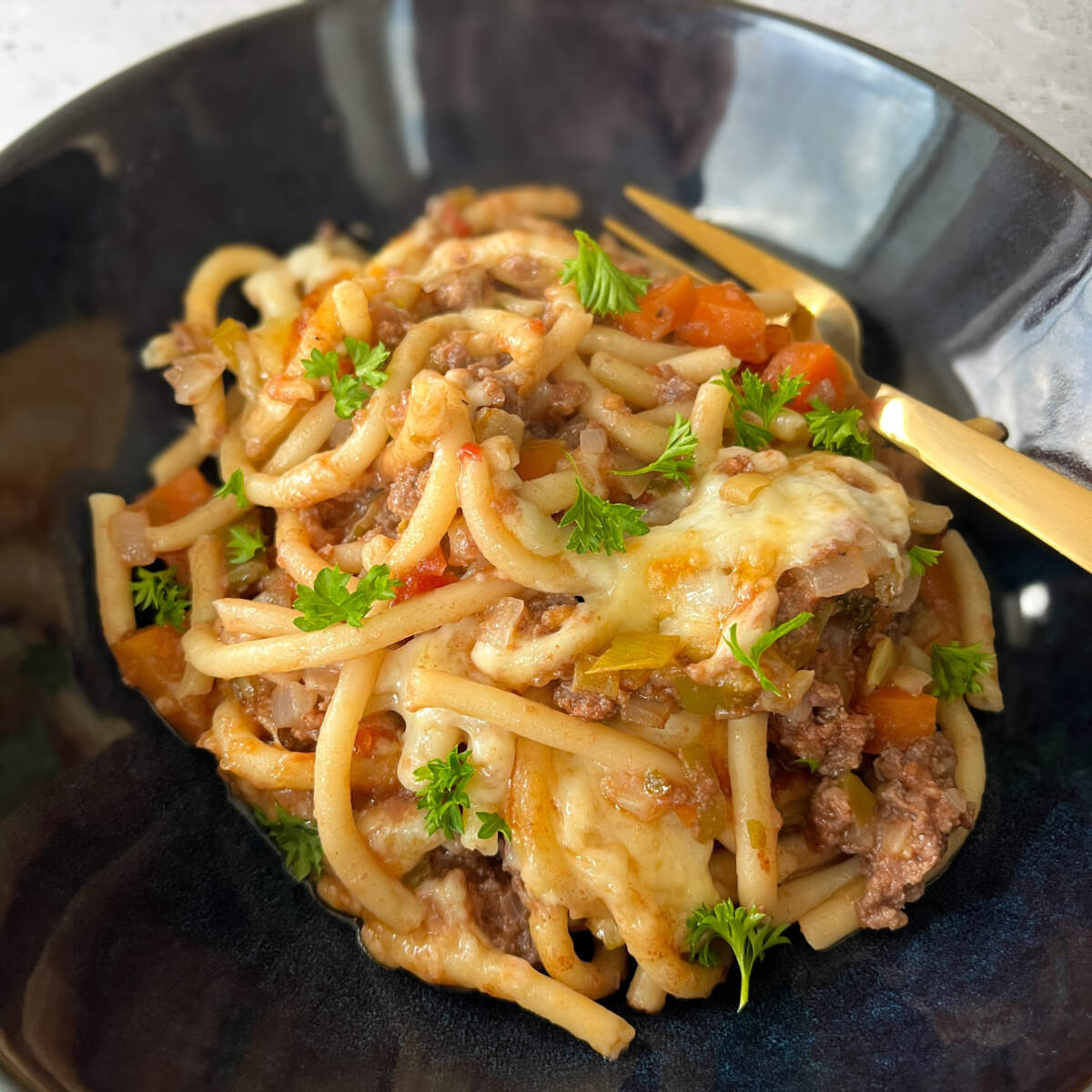 Hvad gør denne gratinerede pastaret speciel? Denne gratinerede pastaret er en lækker kombination af makaroni, saftigt hakket oksekød og friske grøntsager, toppet med et gyldent og sprødt lag smeltet ost. Det er en nem pastaret, der både er fyldig, smagfuld og elsket af hele familien. Kan jeg bruge andre typer pasta i opskriften? Ja, du kan sagtens udskifte makaronien med andre pastaformer, som fx penne, skruer eller rigatoni. Sørg for at vælge en lidt "tykkere" type pasta, der kan holde godt på saucen og de andre ingredienser i retten. Kan denne gratinerede pastaret laves i forvejen? Ja da! Du kan forberede pastaretten dagen før, opbevare den i køleskabet og gratinere den i ovnen lige inden servering. Det gør den til en perfekt løsning til travle dage eller middagsgæster. Hvordan gør jeg retten vegetarisk? Hvis du ønsker en vegetarisk version, kan du erstatte oksekødet med fx hakket plantefars, linser eller ekstra grøntsager. Det giver en nem pastaret, der stadig er rig på smag og fylde. Kan jeg fryse retten? Ja, denne gratinerede pastaret egner sig godt til fryseren. Sørg for at lade retten køle helt af, før du fryser den i en lufttæt beholder. Den kan opvarmes i mikroovnen, når du skal bruge den. Hvilke grøntsager kan jeg bruge i opskriften? Du kan variere grøntsagerne alt efter, hvad du har eller bedst kan lide. Peberfrugt, gulerødder, squash eller spinat fungerer godt i denne nemme pastaret. Det er en god måde at få brugt rester på og samtidig tilføje ekstra smag. Har du prøvet denne opskrift?Del dit resultat med @mettesmadmagi på Instagram!