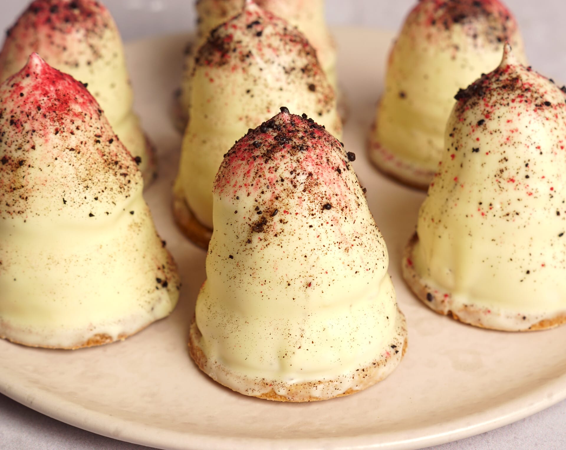 - Drys med hindbærpulver og lakridsgranulat inden chokoladen størkner.