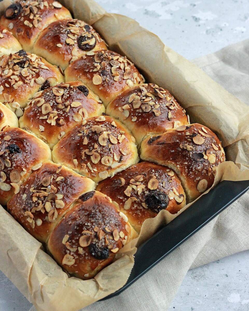 - Drys med hasselnøddeflager og perlesukker ovenpå bollerne.