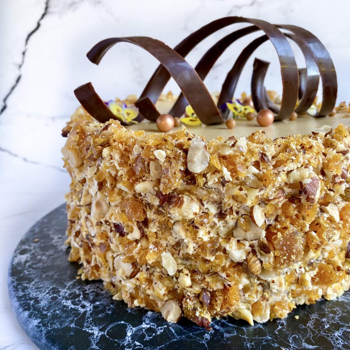 - Fjern siden af springformen og kageplasten, men lad lagkagen stå på bunden af springformen (så er det lettere at styre, når siderne skal dækkes af hasselnødkrokant).