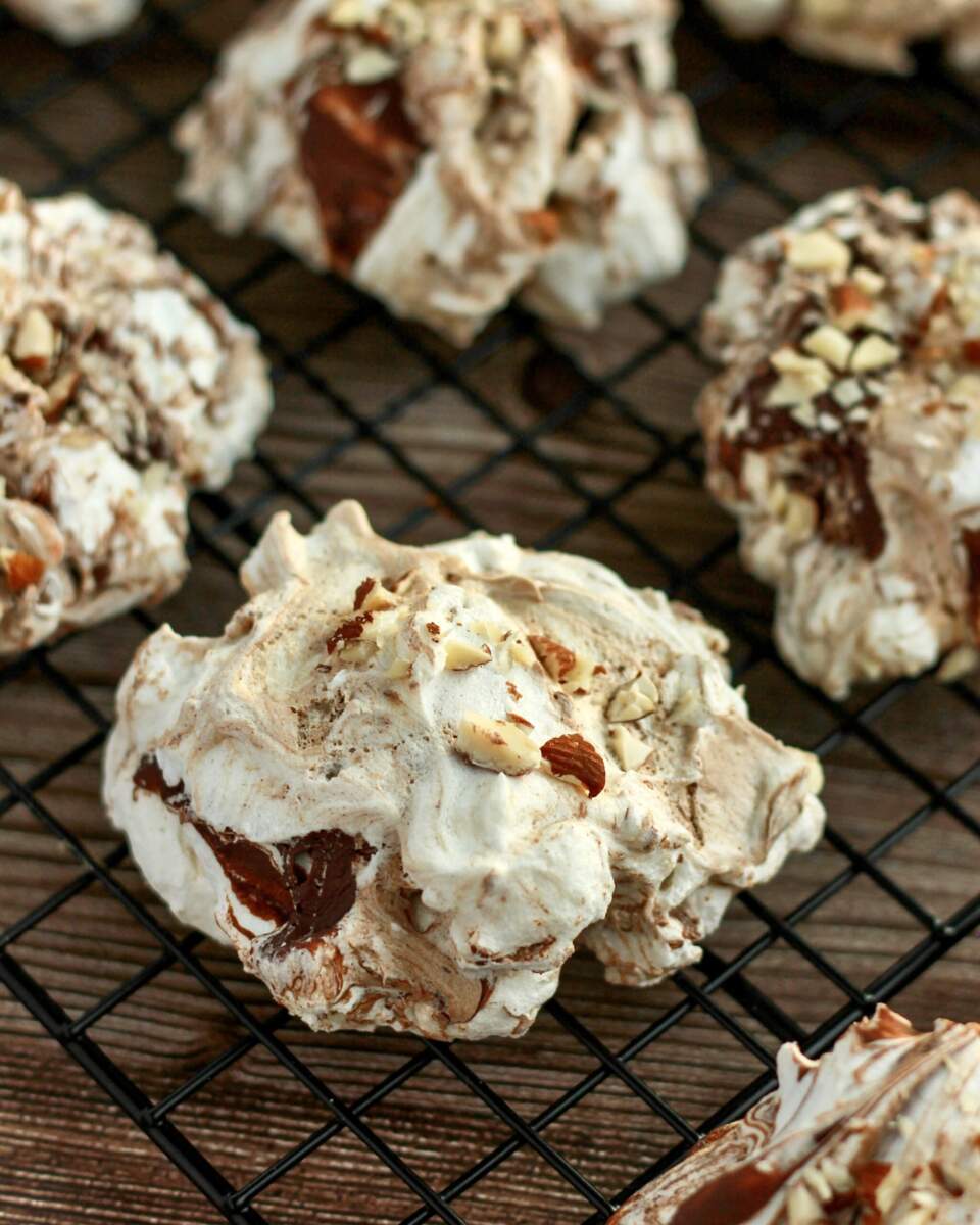 Hvordan får jeg sprøde marengs uden at de bliver brune? Når du laver marengs med chokolade og nødder, er det vigtigt at bage ved lav temperatur, typisk omkring 90 grader varmluft. Den lave varme tørrer marengsene, uden at de tager farve. Kan jeg bruge andre nødder end mandler? Ja, du kan bruge hasselnødder, valnødder eller pistacienødder. Hvordan laver jeg det marmorerede mønster i marengsen? For et flot mønster i din marengs opskrift med chokolade, skal chokoladen vendes forsigtigt i marengsmassen. Rør kun få gange, så der stadig er tydelige striber af chokolade i den hvide masse. Kan marengs med chokolade gemmes til senere? Ja, opbevar dem i en lufttæt beholder ved stuetemperatur. Marengs med chokolade og nødder holder sig sprøde i flere dage, hvis de ikke udsættes for fugt. Kan jeg lave marengs uden chokolade? Hvis du ønsker en klassisk version, kan du sagtens lave marengs uden chokolade. Du kan i stedet drysse lidt kakaopulver, frysetørrede bær eller hakkede nødder over inden de bages. Har du prøvet denne opskrift?Del dit resultat med @mettesmadmagi på Instagram!