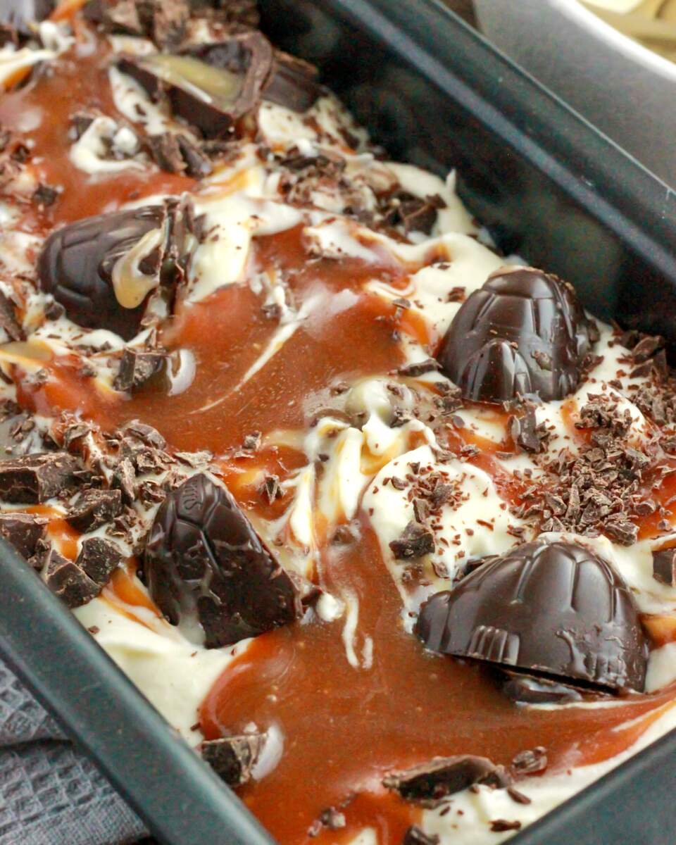 - Fordel 1/3 af de hakkede skildpadder, mørk chokolade og karamelsauce.